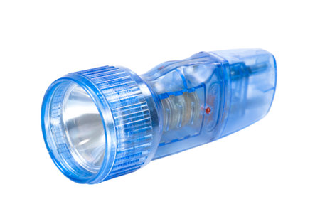 Electric torch made of blue transparent plastic on white