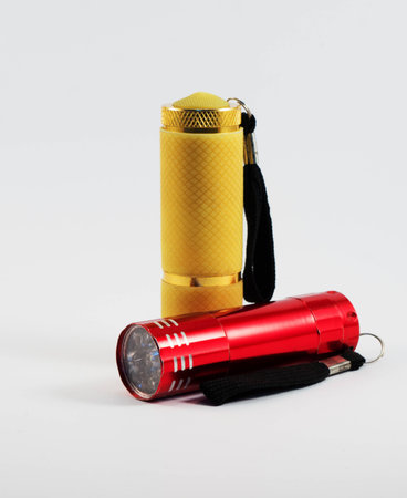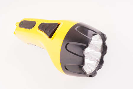 Yellow color torch or flashlight, isolated on grunge or grey background. Copy Space.