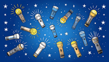 A vibrant blue night sky scattered with various styles of flashlights, their beams shining brightly amidst twinkling stars, creating a dynamic and playful composition