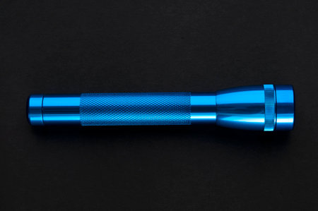 A close-up shot showcases a black flashlight emitting a beam of bright light against a dark blue gradient backdrop. The flashlight's design features intricate texture.