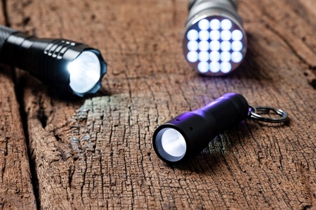 LED flashlight beam illuminating a small object on a wooden table in a dark room