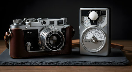 Close up of a vintage photography light meter and a vintage camera.