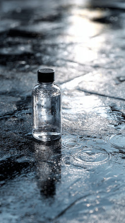 A solitary, weathered glass vessel with a corroded metal top drifts aimlessly on a calm water surface, evoking forgotten journeys and maritime decay.