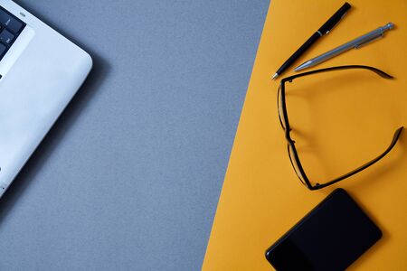Blogging, blog and blogger or social media concept: a laptop, glasses and an external hard drive on a grey and yellow background. Flat lay.