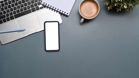 Top view of modern office desk with copy space, smartphone, laptop, coffee cup and supplies