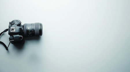 Modern digital SLR camera with telephoto lens isolated on white background with copy space, ideal for photography or technology concept.