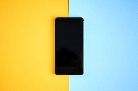 Black cellphone on yellow and blue background composition, mobile phone. Flat lay and top view photo