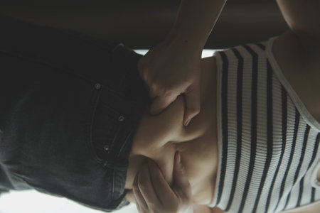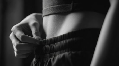 The scene highlights a persons belly fold against snug sportswear bands, emphasizing the contrast of effort during a workout session.