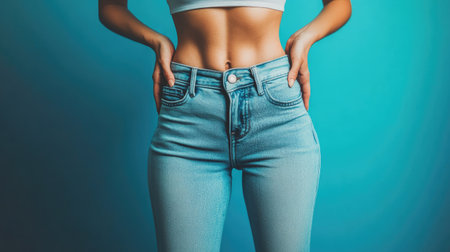 Close-up of a woman attempting to fasten her tight jeans on a blue background.