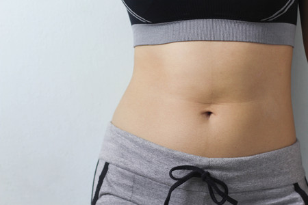 Vacuum belly close up. A swarthy girl in a sports uniform with a slender body pulls in her stomach