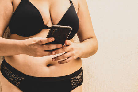Young overweight or plus size woman with fat big belly, surgery and fat splitting concept, xl size people life, fat and fat concept.