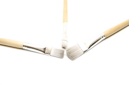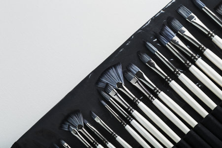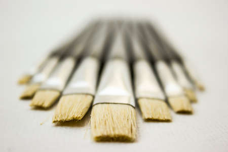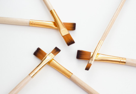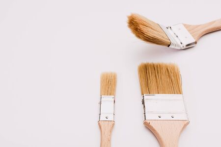 Brushes of different sizes on a white background. Artist's set. Artificial bristles. Preparation for work.