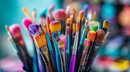 Colorful paintbrushes glass jar blurred background vibrant art tools creative workspace artistic supplies paintbrush set studio equipment artistic