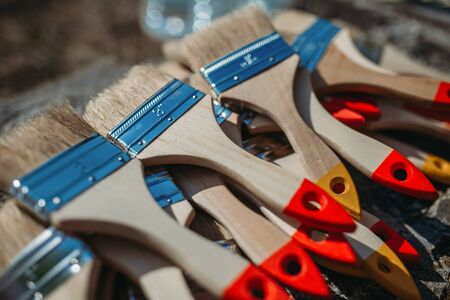 Collection of new paintbrushes of various sizes and styles for painting, crafting, art projects, and detailed hobby work. Tools of artist. New brush set. Drawing tassel variety