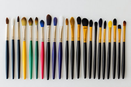 a variety of paintbrushes with white handles, each featuring colorful bristles, arranged against a white backdrop AI generated