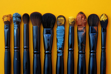 Paintbrushes aligned on a vibrant palette, closeup, soft lighting, colorful artistic backdrop