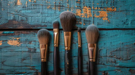 row of artist paintbrushes closeup on old wooden rustic table, retro stylized