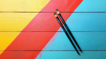 Paint brushes crossing over each other on a brightly painted wood panel background