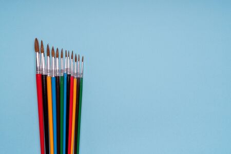 Clean new watercolor paint brushes on light blue background, arts and creativity concept, blank copy space