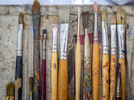 Artistic art supply utensils with paintbrushes isolated on white background with selective focus