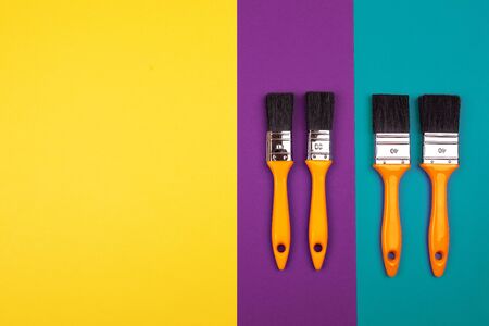 Three brushes with yellow wooden handles on a yellow background. Trending color.