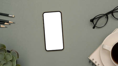 Top view, Workspace with smartphone white blank screen mockup, eyeglasses, pencils, plant, and coffee cup on grey background.