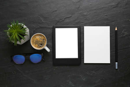 Flat lay composition with modern e-book reader on black table