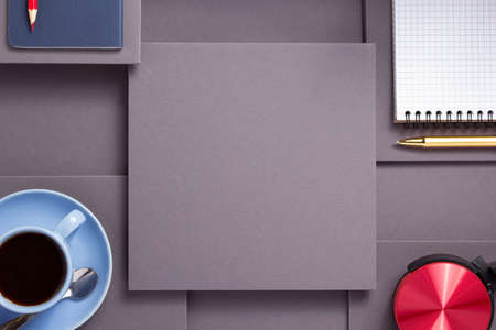 notebook with pen, headphones and cup of coffee at abstract grey paper background, minimalism concept style