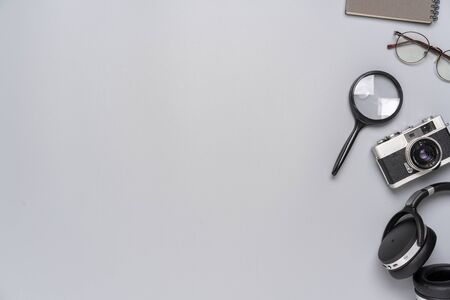 top view image of old camera, film and tape recorder over wooden yellow background. journalism or detective concept