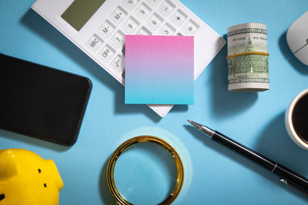 Office desktop with business accessories on blue background with copyspace. Flat lay