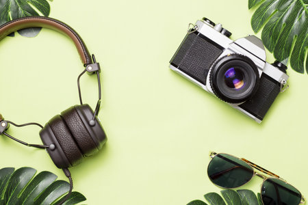 Office colourful desk with photographer supplies, vintage camera and copy space