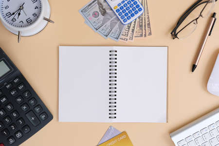 Top view of office desk table with blank notepad, computer keyboard, calculator, credit card and money.