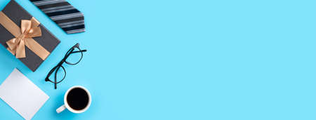 Father's Day gift. Top view design concept of holiday idea with greeting card on blue table background.