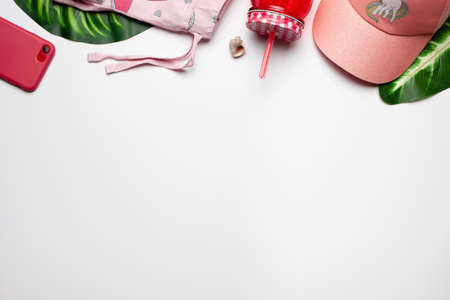 Girls accessories and shorts on white background with seashell and drink with tropical green leaves as a border. Flat lay, top view