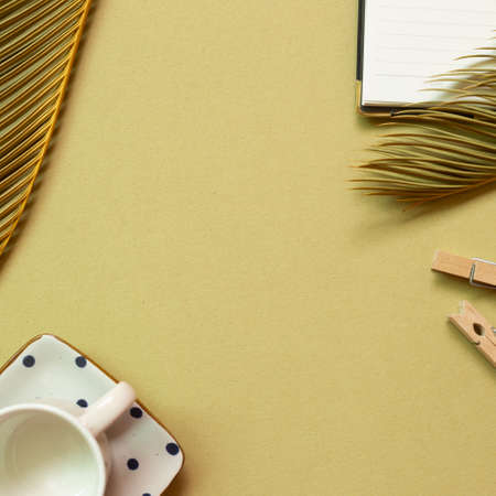 Notepad, wooden clip, cup, plant on khaki green background. workspace. flat lay, top view, copy space