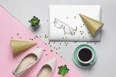 Laptop with party hats, cup of coffee and high-heeled shoes on color background
