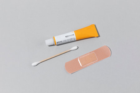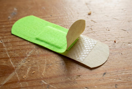 Macro shot detail of first aid dressing with non-stick pad for quick wound healing. Sterile wound dressing with bright color is easy to detect in food manufacturing industry