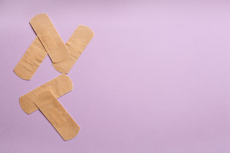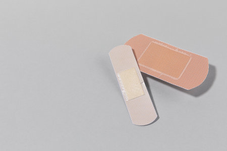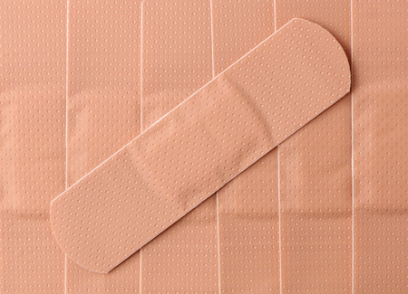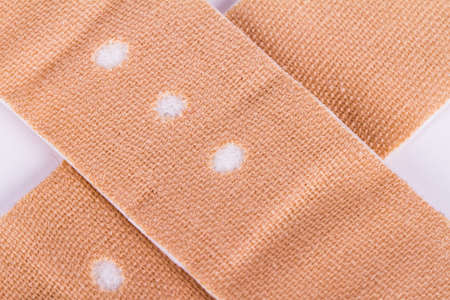 two strips of adhesive plaster tape in cross shape on skin colored paper background