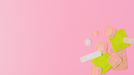 Medical adhesive tape plaster, pink with hearts, isolated on white background. Cross shaped. Protection and care.