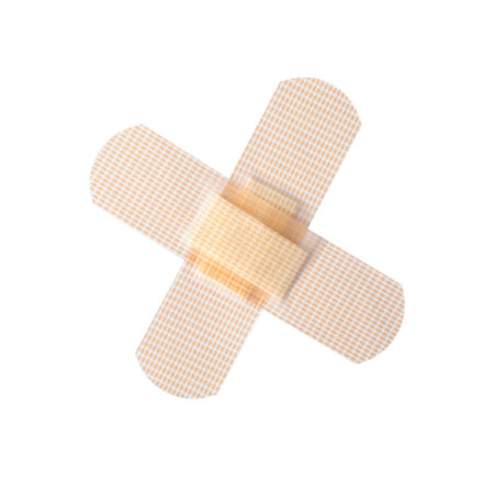 Close up view of adhesive bandage, plaster as cross sign, isolated on white background.
