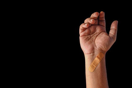 A close-up image of a hand with a small adhesive bandage on the wrist, highlighting themes of care, healing, and injury recovery. The neutral black background enhances the focus on the subject.
