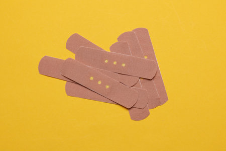 Different types of sticking plasters on yellow background, flat lay. Space for text
