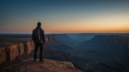 Man Standing on a Cliff Overlooking the Expansive Canyon at Sunset.