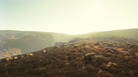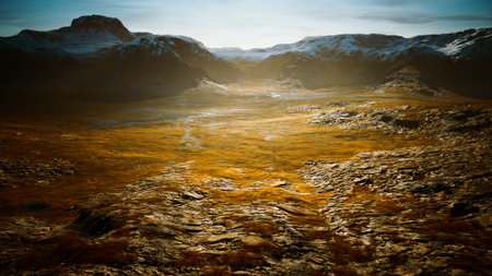 Breathtaking scenery unfolds as sunlight bathes rugged mountains and golden valleys. Natures beauty shines through as a tranquil atmosphere invites exploration and awe at dusk.