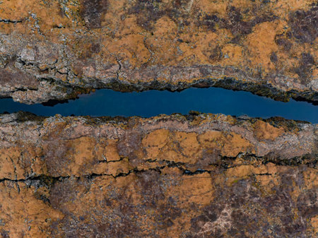 Aerial View of a Deep Earth Crack with Blue Stream in Icelands Volcanic Landscape