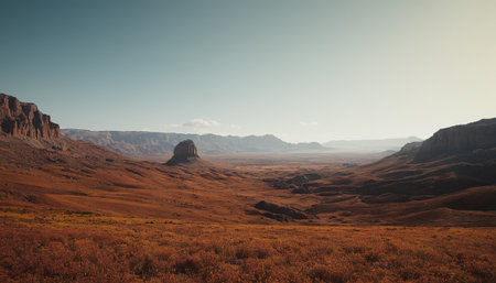 Cinematic view of rocky desert landscape illuminated by sunset colors