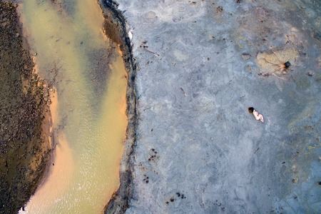 aerial photo of a naked woman lying on the ground next to the river in the zone of ecological disaster, Karabash