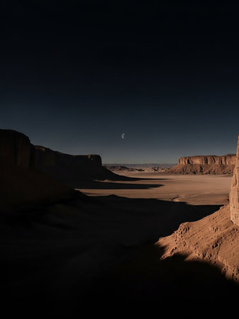 A dramatic desert canyon landscape at dusk features towering rock formations, deep shadows, and a faint crescent moon in the dark sky.