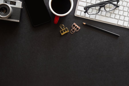 Top view of dark concept office desk with camera, decorations and copy space on black table