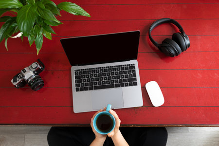 A top view of female hands holding a cup of tea with a laptop, camera, headphones and green plat